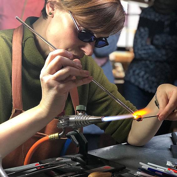 Während eines dreistündigen Kurses erhältst du eine Einführung in das Glasperlen-Kunsthandwerk. Du erlangst Kenntnisse über die verschiedensten Herstellungstechniken und bekommst die Möglichkeit diese unter Anleitung einmal selbst am Zweigasbrenner auszuprobieren. Mit ein wenig Geschick hältst du am Ende des Workshops deine persönliche Glasperle in den Händen.